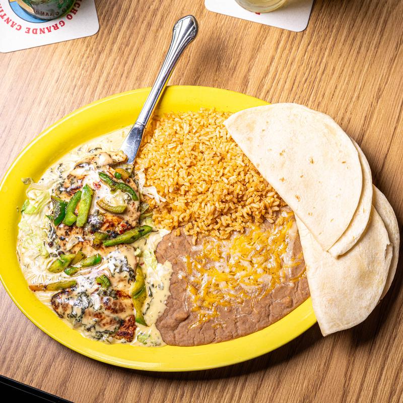 Juicy marinated chicken breast grilled to perfection, smothered with rancho dip and chopped green bell peppers. Served with rice & beans and choice of tortillas