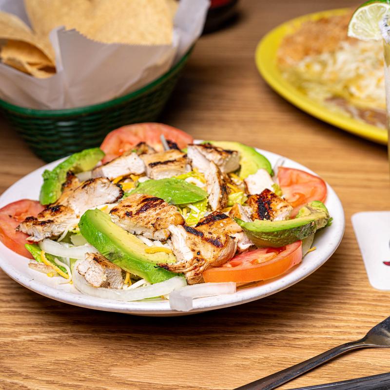 Romaine lettuce chopped, marinated grilled chicken breast, sliced avocados, onions, tomatoes, cheese and choice of dressing