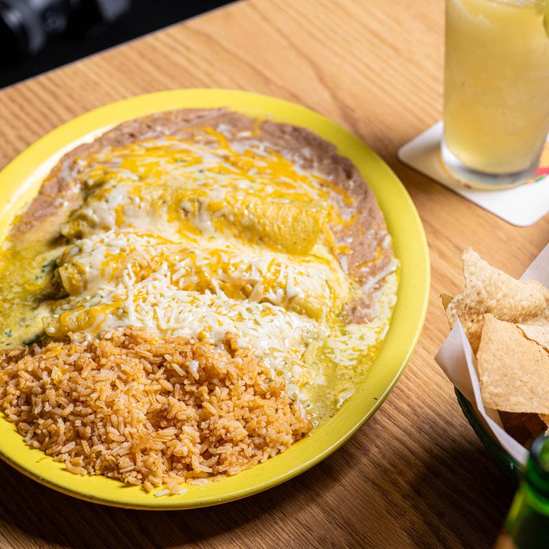Three cheese & onion enchiladas topped with our enchilada sauce and melted cheese. Served with beans & rice