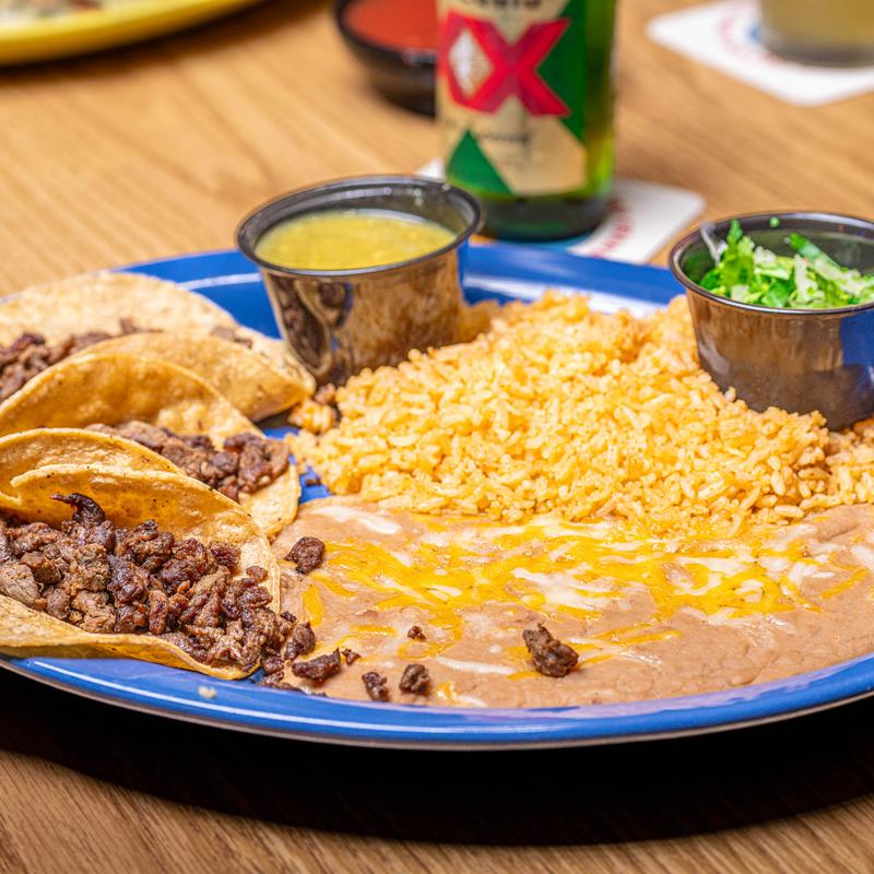 Three street tacos served with Al Pastor (marinated pork) or carne asada served with corn tortillas with cilantro, onions, green sauce, beans & rice