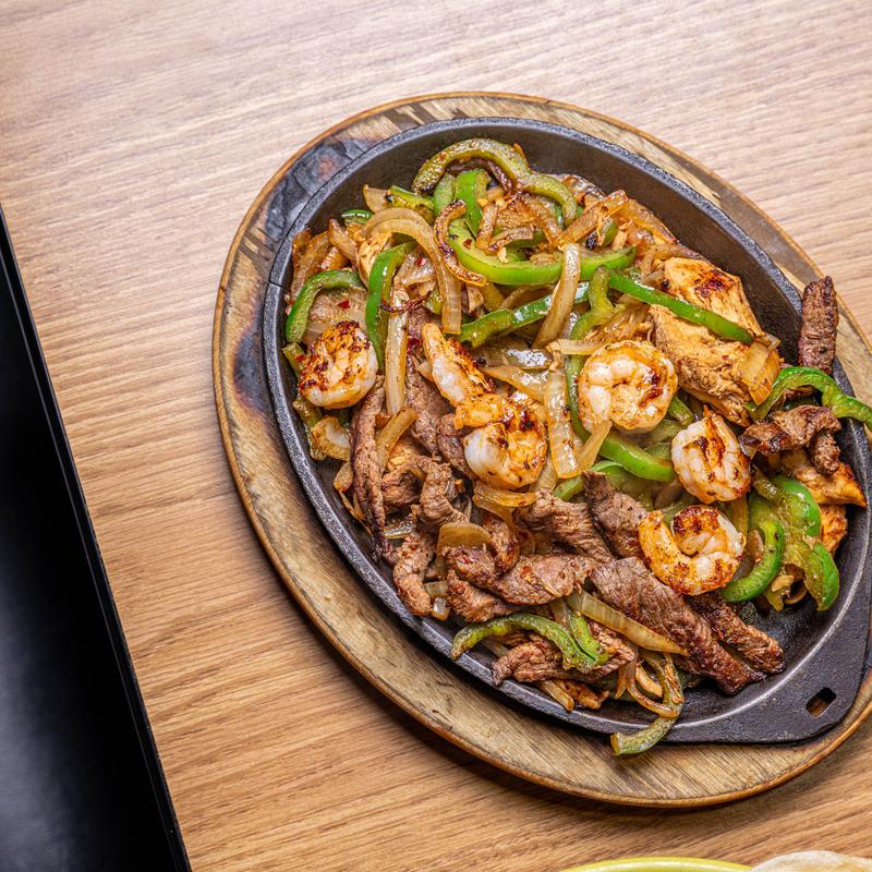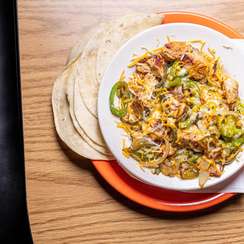 A Full order of steak or chicken fajitas with grilled onions and peppers