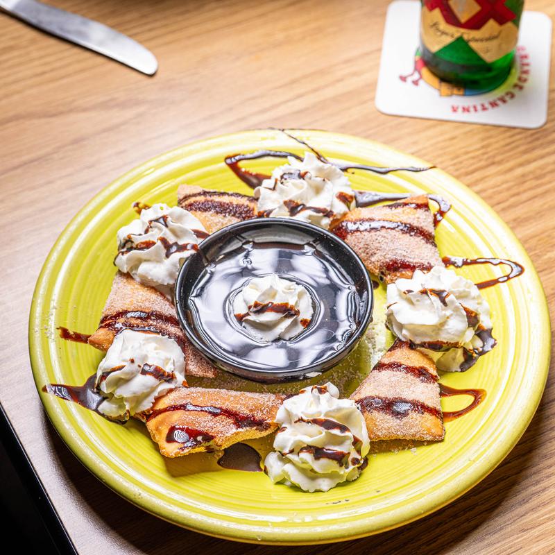 Pork, chicken chorizo, ground beef or shredded beef wrapped in a tortilla with shredded cheese, deep-fried and covered in red sauce. Served with sour cream & guacamole